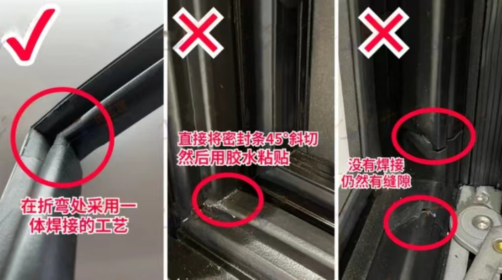 很多商家在密封膠條的轉(zhuǎn)彎處,直接切斷,簡(jiǎn)單的用膠水粘合或者不做任何處理,這樣整窗的密封性都會(huì)受到很大的影響。